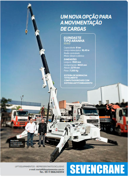 "A Lift equipamentos além de ser representante exclusiva há mais de 30 anos da empresa americana Lift Systems fabricante de pórticos hidraulicos atualmente se tornou representante exclusiva da empresa SevenCrane fabricante do guindaste compacto tipo aranha. A Transremoção Transportes Pesados foi a primeira a adequirir esse equipamento em 2021. Já executou vários trabalhos sendo elogiado pelos operadores e clientes por ser extremamente compact, com esteiras de borracha e totalmente computadorizado excelente para dentro de fábricas."